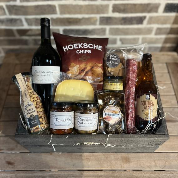 Een echt borrel pakket voor onze Gijs. Een smaakvolle cervelaat, olijven en kaas kunnen niet ontbreken op ieders borrelplank. Onder het genot van een wijntje of een biertje valt dit bij ieder goed in de smaak.