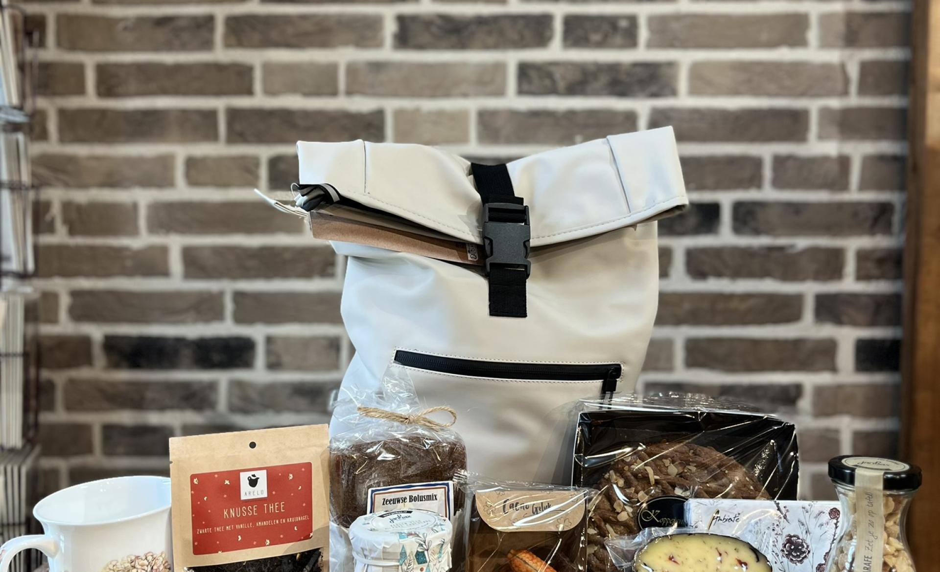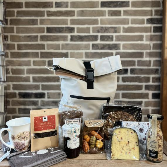 Deze te leuke rugzak gevuld met heerlijke producten. Dit (vrouwen)pakket is een combi van zoete en bak-gerelateerde producten met daarnaast een stukje kaas en wat nootjes in. De tas is verkrijgbaar in 3 kleuren (wit, donkerblauw en grijs).